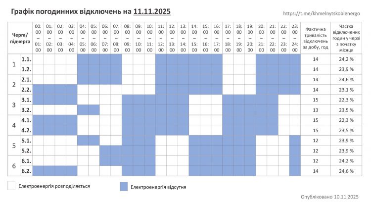 Водночас в обленерго наголошують, що це прогнозований графік, а не остаточний розклад. Ситуація в енергосистемі залишається динамічною — на її стан впливають погодні умови, рівень споживання та інші фактори.
