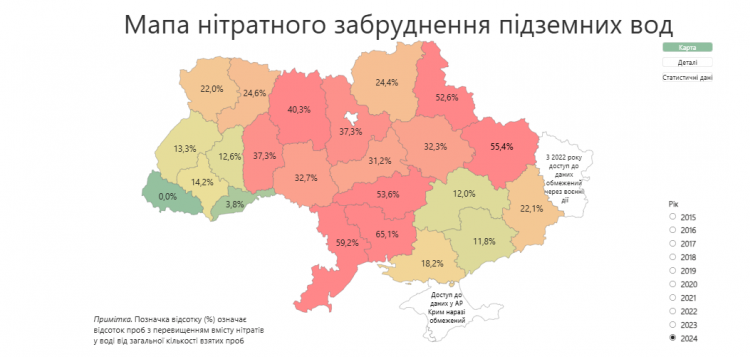 В Україні представили інтерактивну мапу нітратного забруднення підземних вод. Дані за 2024 рік свідчать, що в окремих регіонах більше половини проб води з колодязів та свердловин не відповідають санітарним нормам щодо вмісту нітратів.