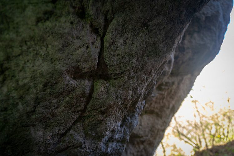 Просто під печерою біля основи скелі маємо ще оду унікальну історичну пам’ятку. Колись дуже-дуже давно від основного скельного масиву тут відкололася величезна, розміром з міжміський автобус, каменюка і трохи посунулася по схилу гори. Між нею та скелею утворилася вузька ущелина. За такою схемою, до речі, колись утворилося знамените святилище у Буші.