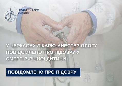 За процесуального керівництва ювенальних прокурорів Черкаської окружної прокуратури лікарю-анестезіологу повідомлено про підозру у неналежному виконанні професійних обов’язків, що спричинило смерть малолітнього.
