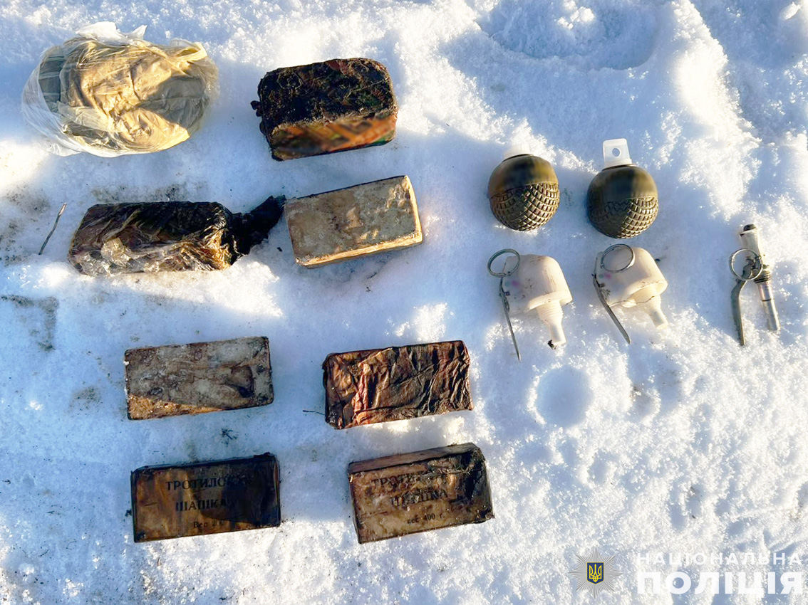 Поліцейські встановили, що зловмисник в період перебування на волі мав у своєму розпорядженні певну кількість вогнепальної зброї, набоїв та вибухівки – зокрема, 3 автомати Калашникова калібру 5,45 мм, понад 800 набоїв до них, дві ручні гранати, понад 2 кг тротилу в шашках по 200 та 400 грамів, а також більше ніж пів кілограма пластичної вибухівки на основі гексогену. Ці предмети фігурант розподілив по «схронах» у приміській дачній місцевості під Черніговом, замаскував схованки та зафіксував їхні точні координати.