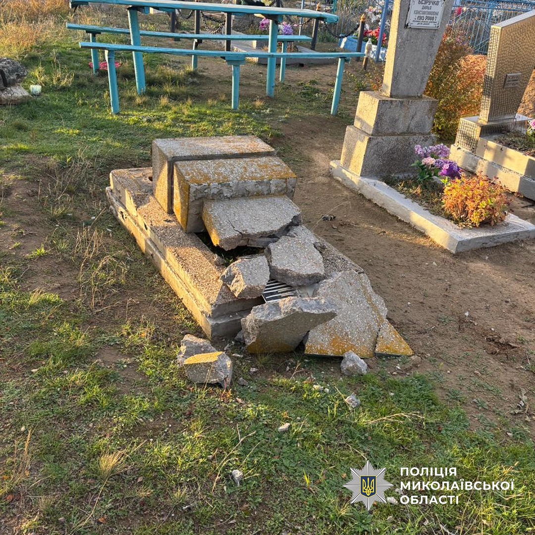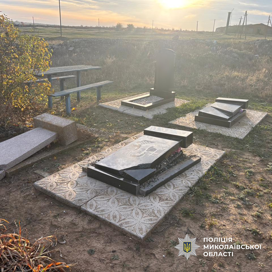 Двоє мешканців Снігурівської громади 9 та 11 років поламали надгробні плити та хрести на десятках місць поховань. За фактом наруги над могилами слідчі відкрили кримінальне провадження. На батьків правопорушників поліцейські складуть адмінматеріали за невиконання обов’язків щодо виховання дітей. А відносно старшого за віком готуватимуть клопотання до суду про застосування примусових заходів виховного характеру.