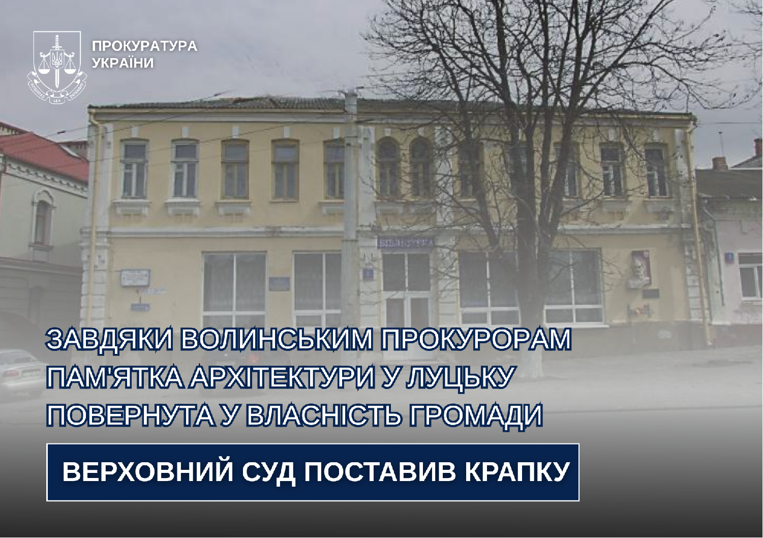 Верховний Суд задовольнив касаційну скаргу Волинської обласної прокуратури, залишивши у силі рішення Господарського суду Волинської області, яким задоволено позов обласної прокуратури про повернення з незаконного володіння приватного підприємства у комунальну власність приміщення пам’ятки архітектури місцевого значення на вулиці Драгоманова, 1 у Луцьку.