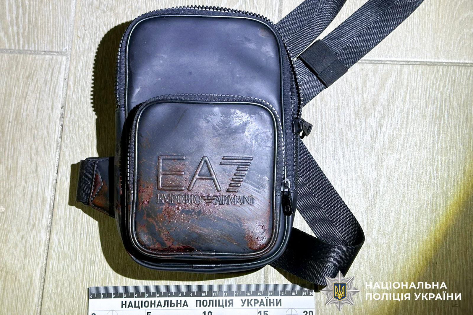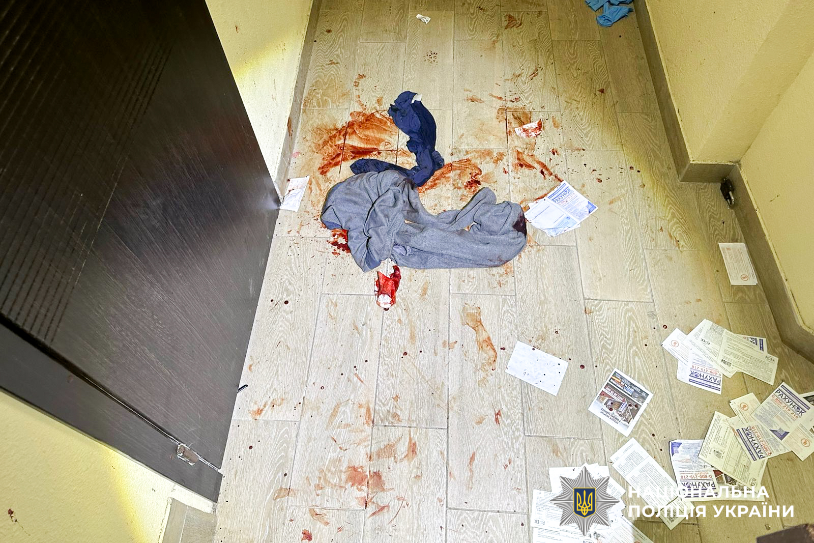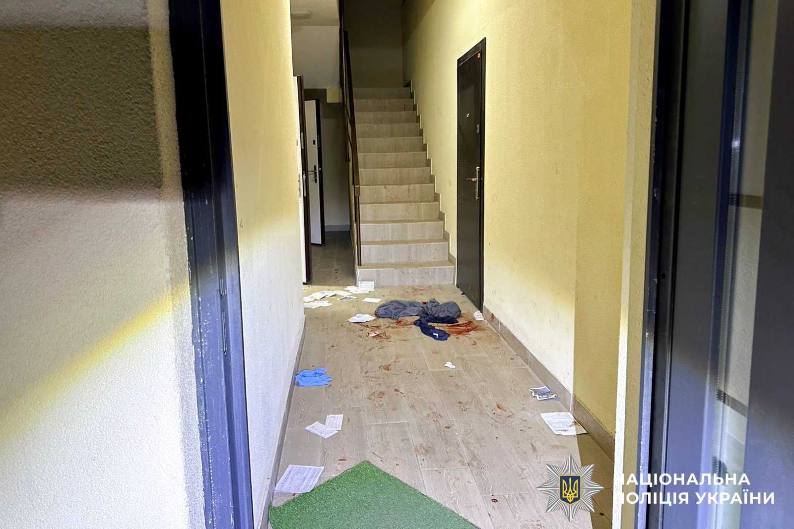 Правоохоронці, які прибули на місце події, виявили на першому поверсі закривавленого 32-річного місцевого жителя. Поруч — наплічна сумка, яку залишив зловмисник, а сам втік.