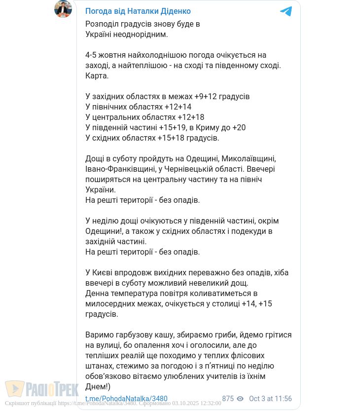 Синоптикиня Наталка Діденко повідомила, що 4-5 жовтня в Україні збережеться неоднорідний розподіл температури.