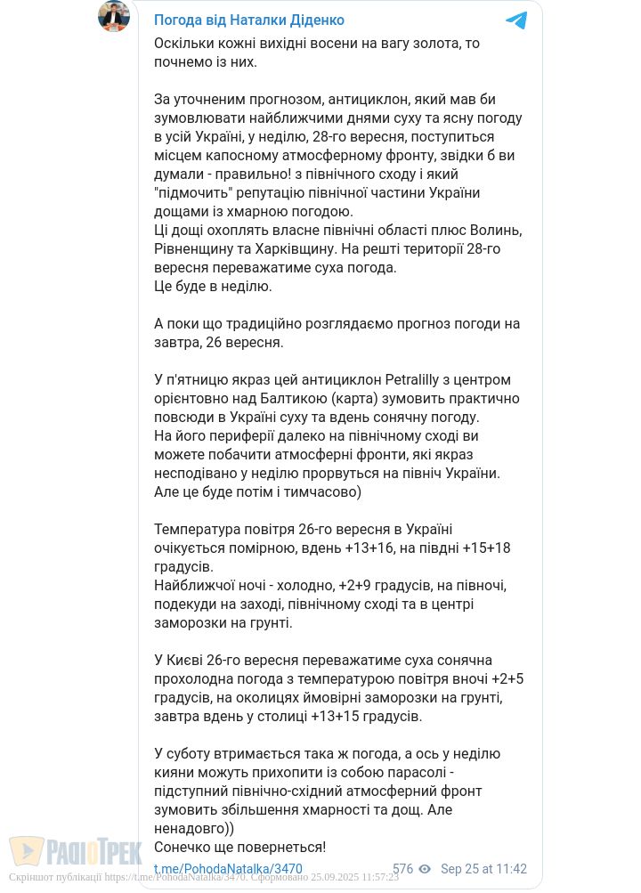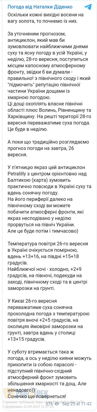 28 вересня антициклон поступиться місцем атмосферному фронту з північного сходу. Він принесе дощі та хмарність на північ України, а також у Волинську, Рівненську та Харківську області.