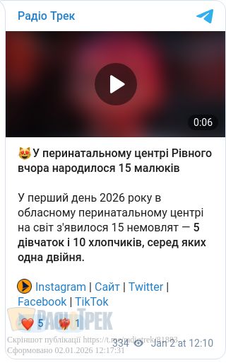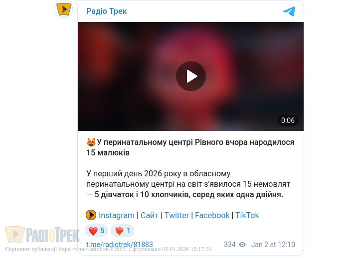 У перший день 2026 року в обласному перинатальному центрі народилося 15 немовлят — 5 дівчаток і 10 хлопчиків, серед яких одна двійня. Першою на світ у новорічну ніч з’явилася дівчинка вагою 2 кг 930 г і зростом 51 см.