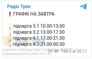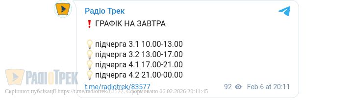 Згідно з попереднім планом, світло вимикатимуть за підчергами у такі години: