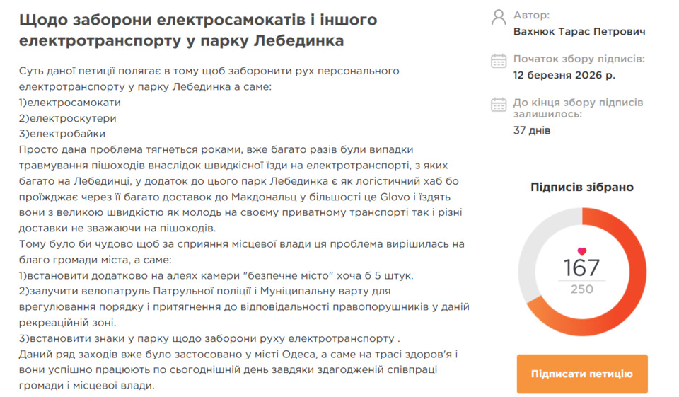 У петиції зазначають, що проблема існує вже не перший рік. У парку неодноразово травмувалися пішоходи через швидку їзду.