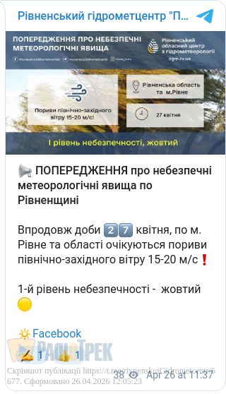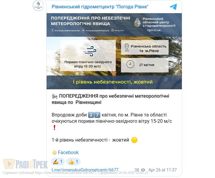 Завтра,27 квітня, у Рівному та області буде вітряна погода. Пориви північно-західного вітру сягатимуть 15-20 м/с.
