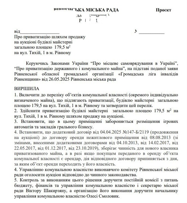 Рішення про дозвіл продажу приміщення на аукціоні ще мають погодити депутати Рівнеради на сесії.