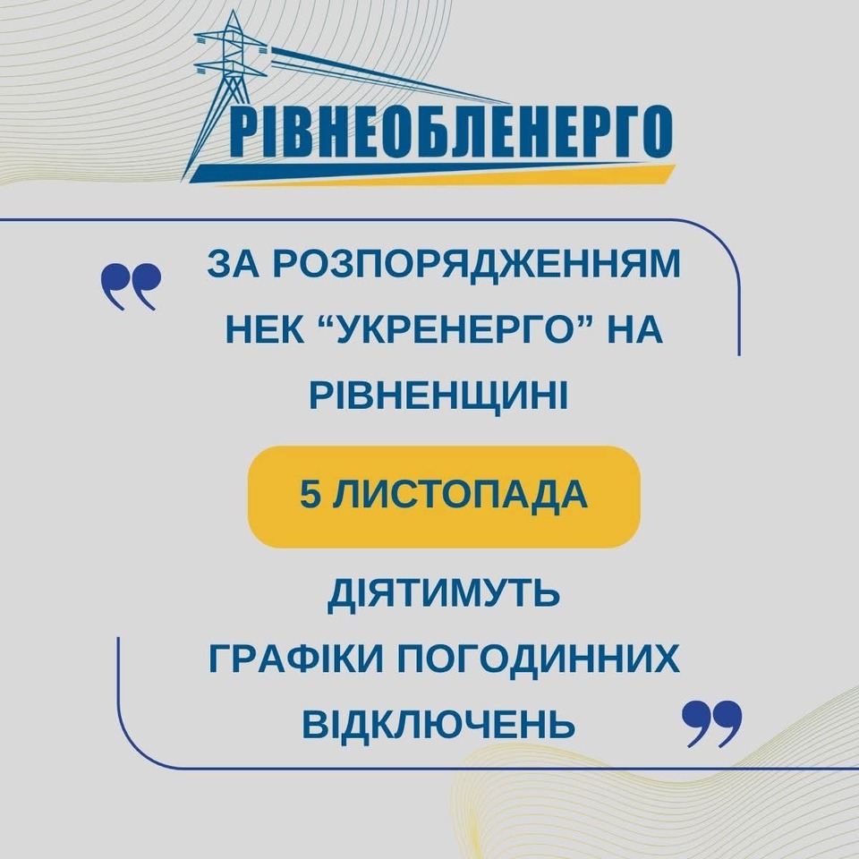 У зв’язку зі складною ситуацією в енергосистемі держави за командою НЕК «Укренерго» на Рівненщині 05.11.2025 з 07.00 до 21.00 заплановані графіки погодинних відключень для побутових споживачів.