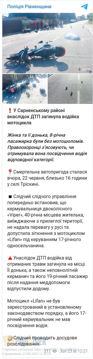 У Сарненському районі внаслідок ДТП загинула водійка мотоцикла. Смертельна автопригода сталася вчора, 22 червня, близько 16 години у селі Тріскині.