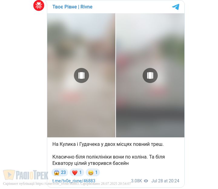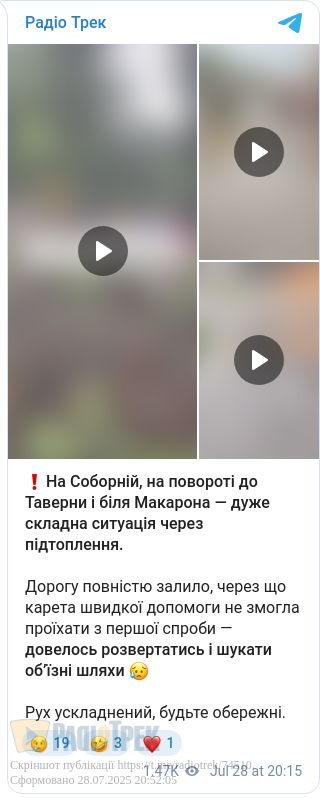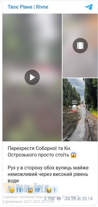 Також стоїть перехрестя Соборної та князя Острозького. Рух в сторону обох вулиць майже не можливий через високий рівень води.