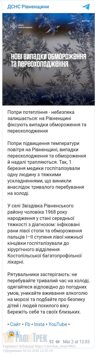 Чоловік постраждав від холоду на Рівненщині. Напередодні, 57-річного жителя села Звіздівка терміново госпіталізували до хірургії Костопільської багатопрофільної лікарні.