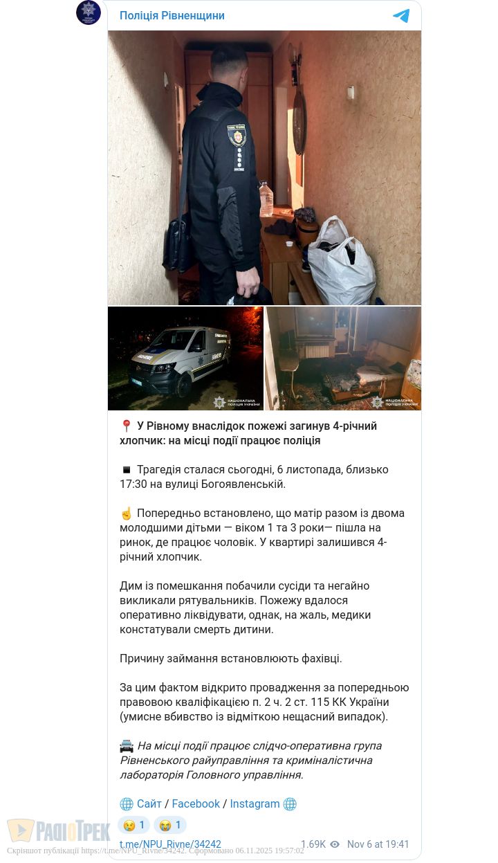 У Рівному під час пожежі загинув 4-річний хлопчик. Трагедія сталася 6 листопада близько 17:30 на вулиці Богоявленській.