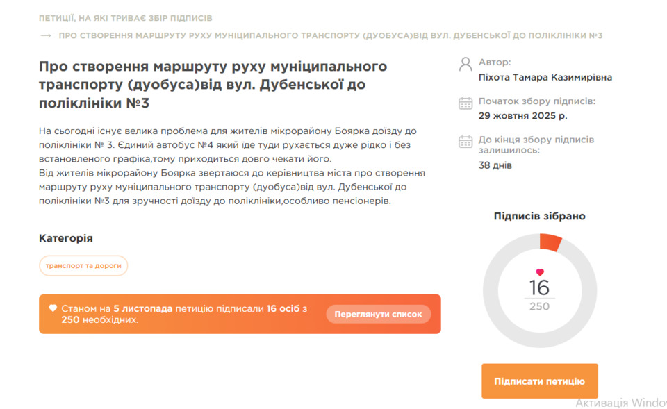 Петиція про створення маршруту руху громадського транспорту від вул. Дубенської до поліклініки №3