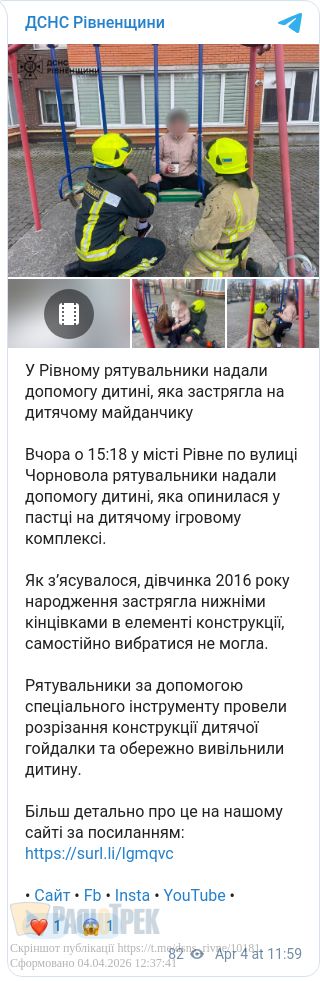 Інцидент стався вчора в обід на вулиці Чорновола на дитмайданчику. Дівчинка 2016 року народження застрягла ногами в гойдалці та не могла самостійно вибратися.