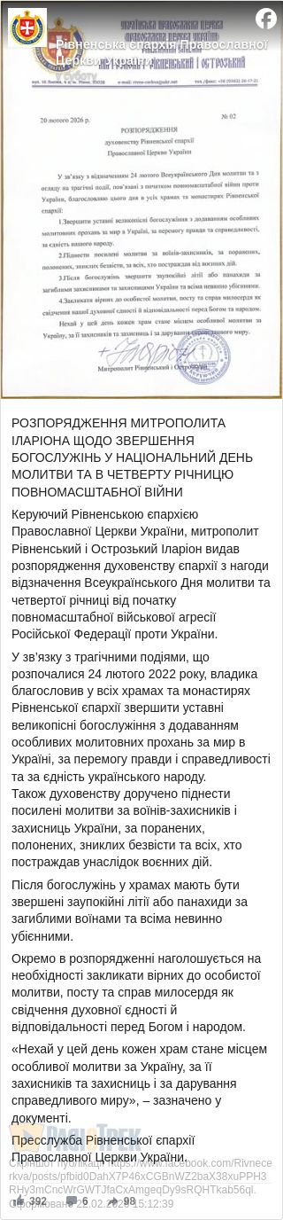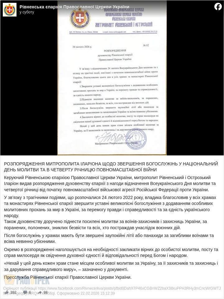 У храмах Рівненської єпархії ПЦУ проведуть богослужіння. Відповідне розпорядження видав Митрополит Іларіон. Цього дня звершать великопісні служби з особливими молитвами за мир, військових і єдність народу.   Після цього відбудуться панахиди за загиблими.