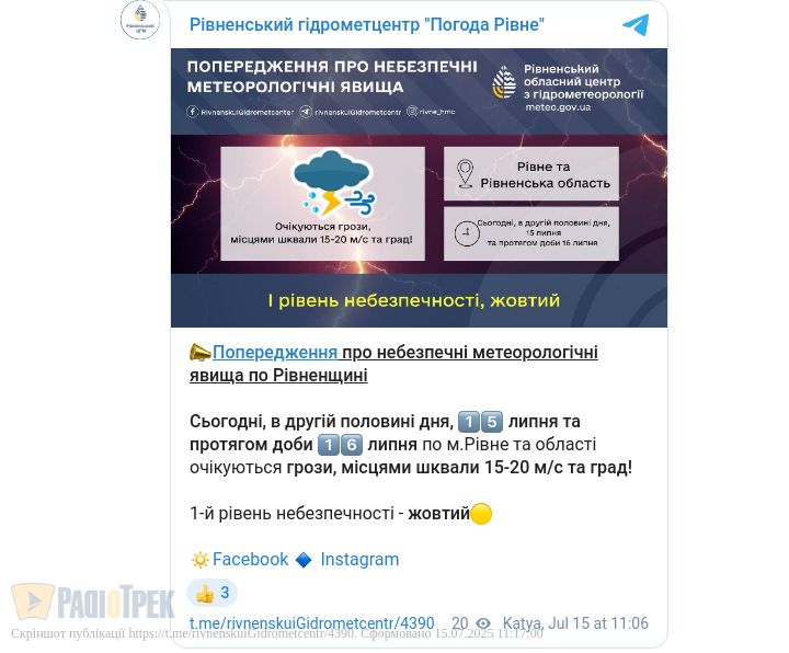 Сьогодні в другій половині дня та впродовж доби 16 липня у Рівному та області очікуються грози, місцями шквали до 15-20 м/с та град.