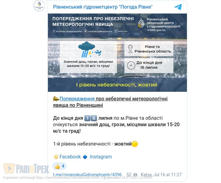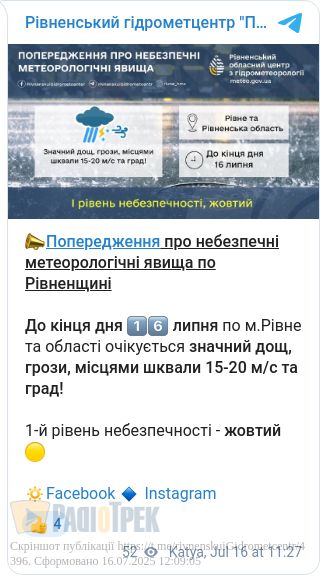 Синоптики обласного гідрометцентру прогнозують значний дощ, грози, місцями шквали до 15-20 м/с та град.