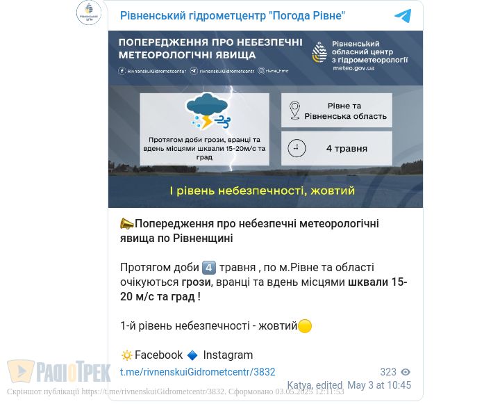 Завтра, 4 травня, у Рівному та області очікується негода.