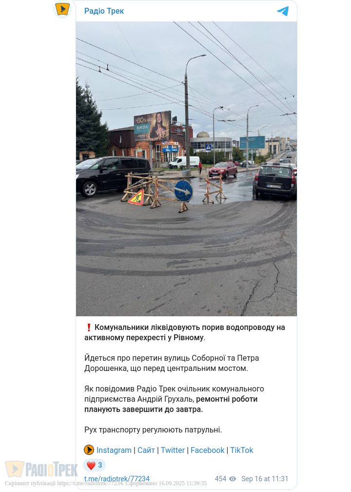 Прорив водопроводу стався на активному перехресті у Рівному. Йдеться про перетин вулиць Соборної та Петра Дорошенка, що перед центральним мостом.