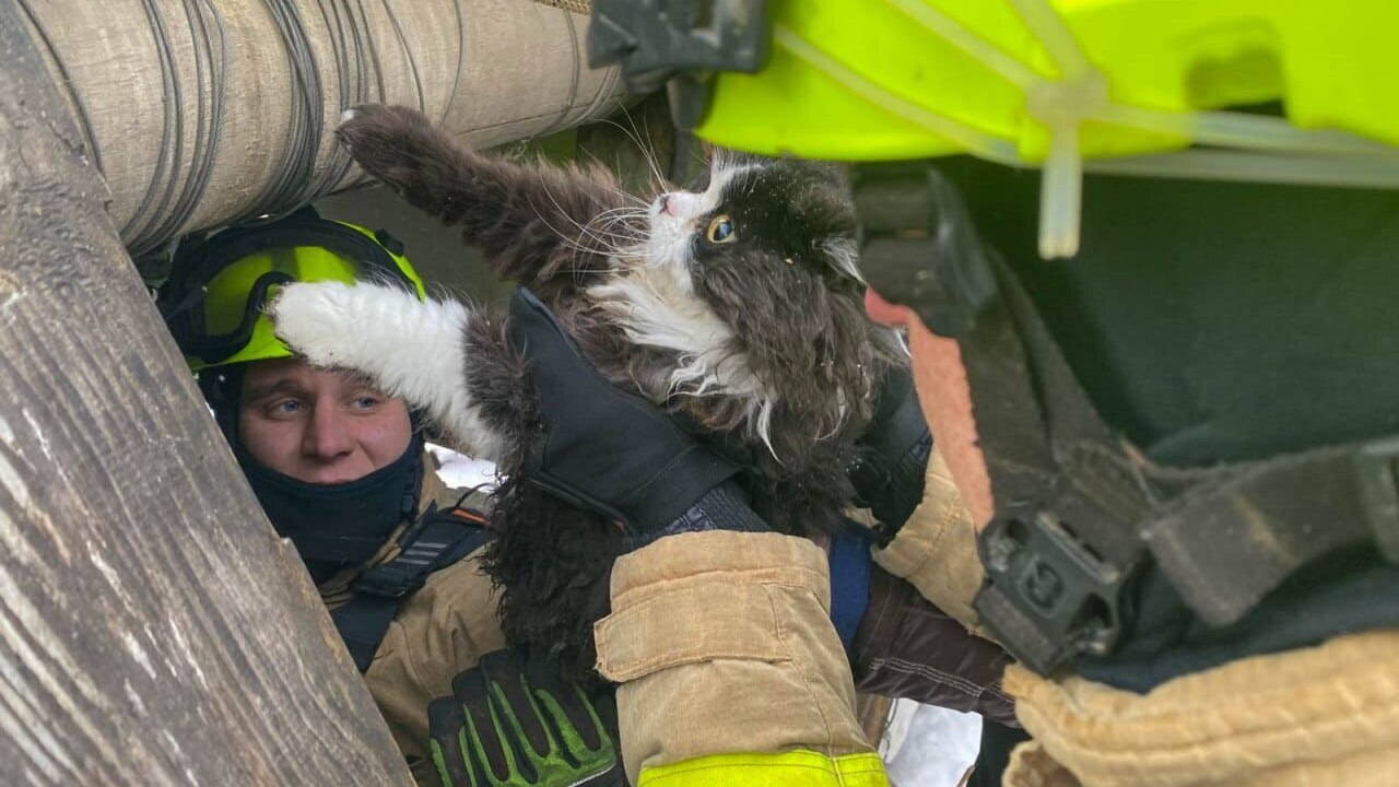 На місце події прибули співробітники ДСНС, які за допомогою спеціального спорядження обережно підняли кота на поверхню.