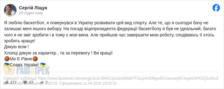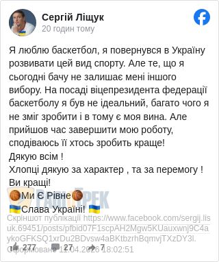 Ніби все добре, але, як можна зрозуміти з коментарів під тим самим дописом Сергія Ліщука, судді в той день робили все ж забагато «помилок» НЕ на користь БК «Рівне».