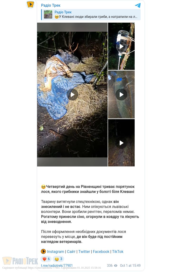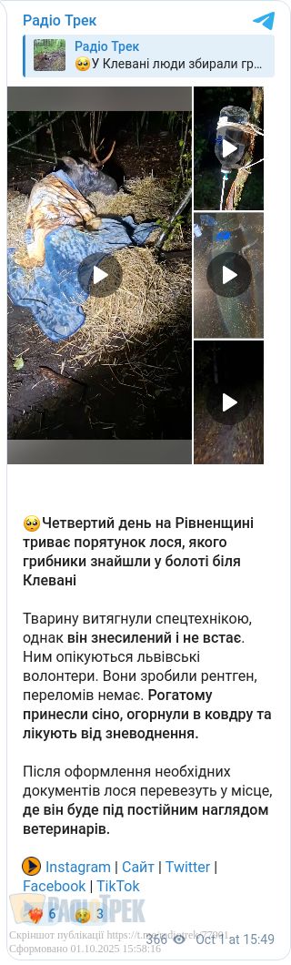 Четвертий день поспіль на Рівненщині триває операція з порятунку лося. Нагадаємо, на вихідних неподалік Клевані грибники знайшли рогатого, який застряг у болоті. Йому принесли їжі та води, і за допомогою спецтехніки витягнули.