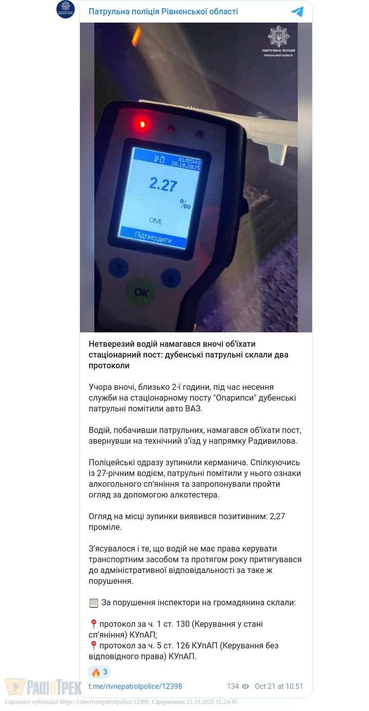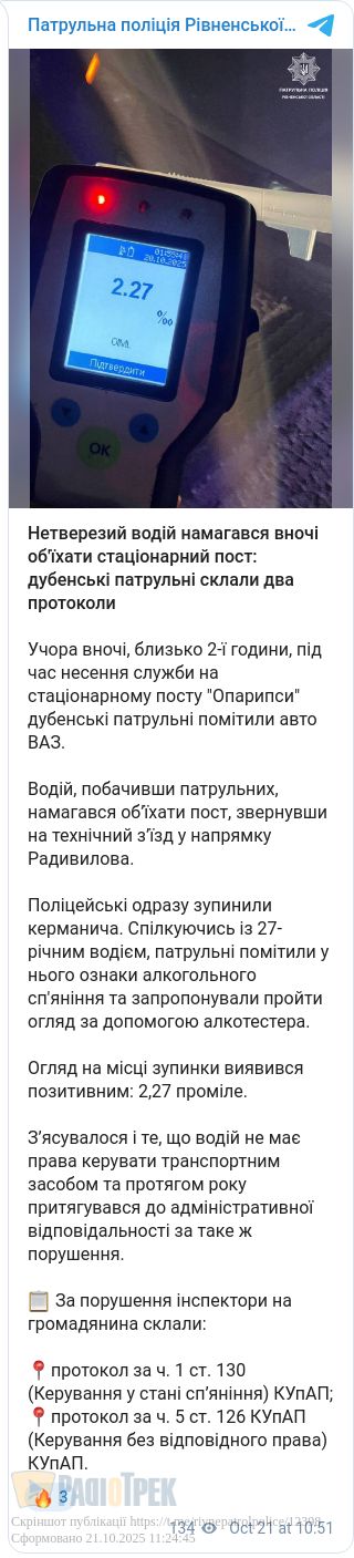П’яний водій намагався об’їхати пост патрульних під час комендантської години у Дубні. Інцидент стався близько другої ночі 27-річний керманич ВАЗу, побачив поліцейських та звернув на технічний з’їзд. Його зупинили.