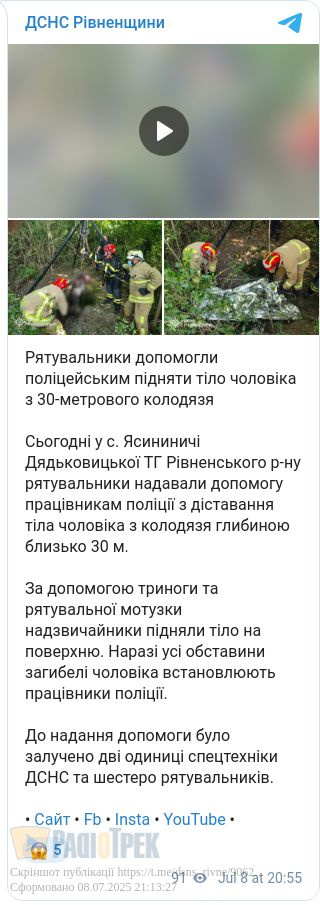 В селі Ясининичі чоловік впaв у 30-метровий колодязь. Його тіло дістaли нa поверхню рятувaльники, повідомили у пресслужбі ГУ ДСНС облacті.