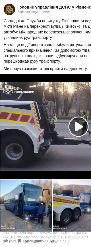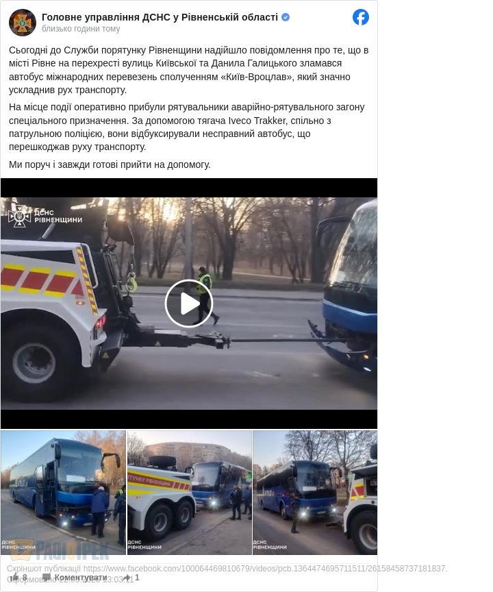 Рятувальники Рівненщини сьогодні зранку розблокували рух на перехресті вулиць Київської та Данила Галицького. Там зламався автобус міжнародних перевезень сполученням «Київ-Вроцлав», який значно ускладнив рух транспорту.   За допомогою тягача Iveco Trakker, спільно з патрульною поліцією, вони відбуксирували несправний автобус, що перешкоджав руху транспорту.   Чи були в автобусі пасажири, та як вони продовжать поїздку – у повідомлені не уточнюється.