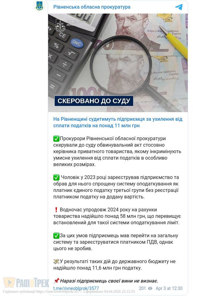 Як повідомили в обласній прокуратурі, керівник приватного товариства у 2023 році обрав спрощену систему оподаткування третьої групи без ПДВ, але наступного року на рахунки компанії надійшло понад 58 млн грн, перевищивши ліміт.
