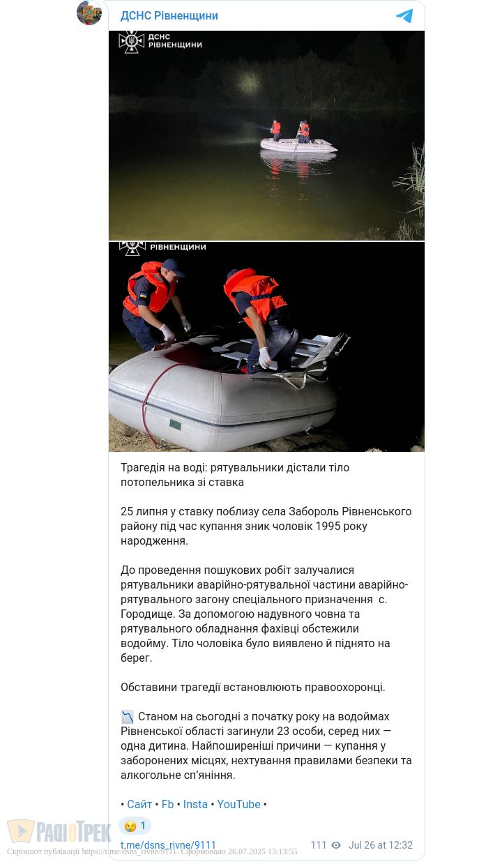 Станом на сьогодні з початку року на водоймах Рівненської області загинули 23 особи, серед них — одна дитина. Найпоширеніші причини — купання у заборонених місцях, нехтування правилами безпеки та алкогольне сп’яніння.