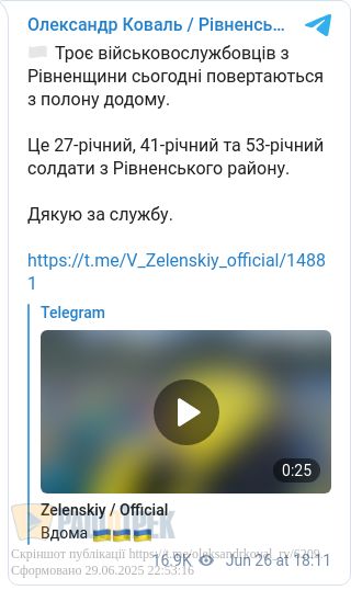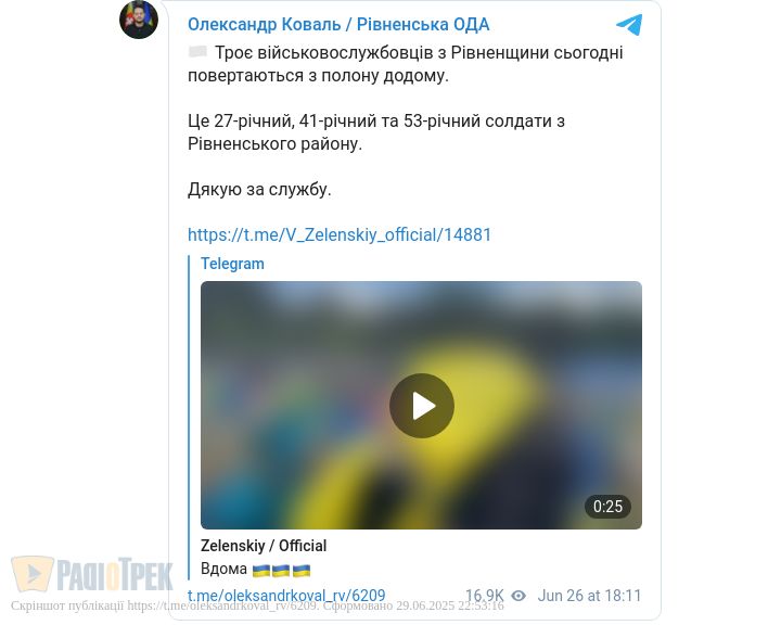 Троє військовослужбовців з Рівненщини повернулися з полону 26 червня. Це був черговий етап обміну полоненими в межах домовленостей під час другого раунду переговорів у Стамбулі.