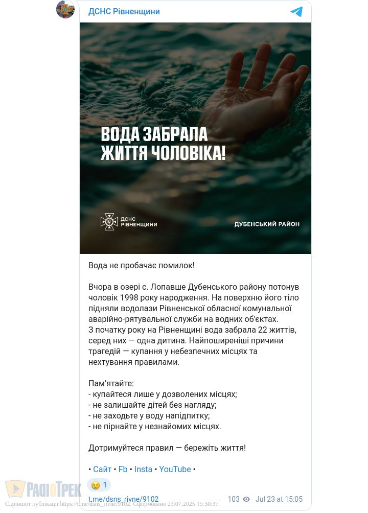 За словами рятувальників, з початку року вода забрала 22 жителів Рівненщини, серед них — одна дитина. Найпоширеніші причини трагедій — купання у небезпечних місцях та нехтування правилами.