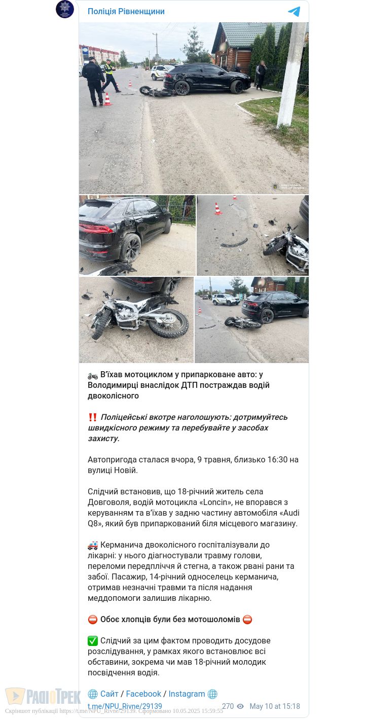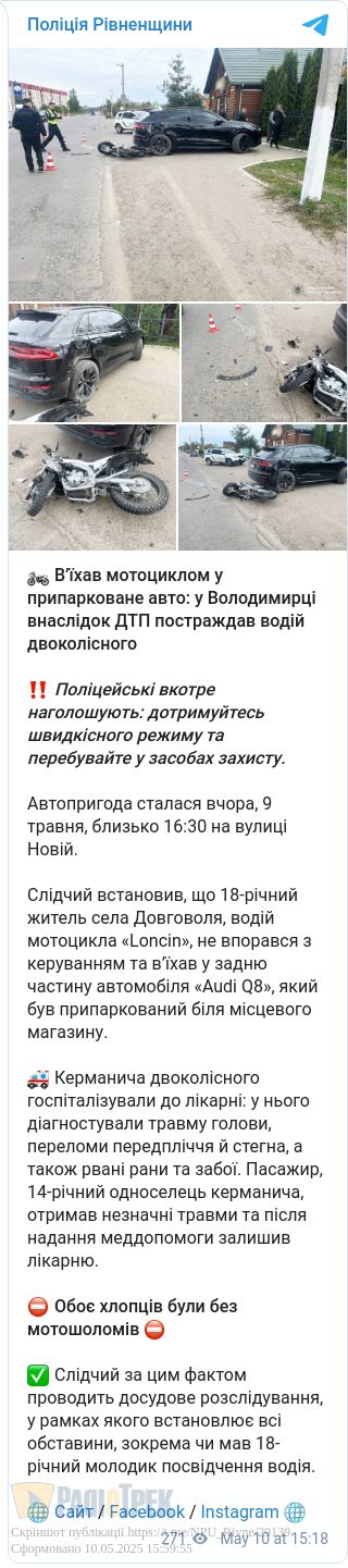 Внаслідок ДТП водія двоколісного госпіталізували. У нього діагностували травму голови, переломи передпліччя й стегна, рвані рани та забої. 14-річний пасажир також отримав травми. Однак після надання меддопомоги його відпустили додому, повідомили у відділі комунікації поліції Рівненщини.