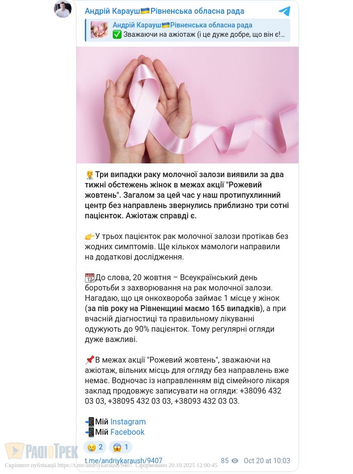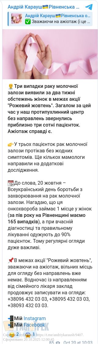 Три випадки раку молочної залози виявили під час обстежень в межах акції «Рожевий жовтень» у Рівненському обласному протипухлинному центрі. Хвороба протікала без видимих симптомів.