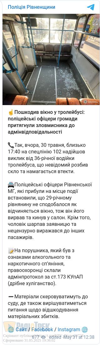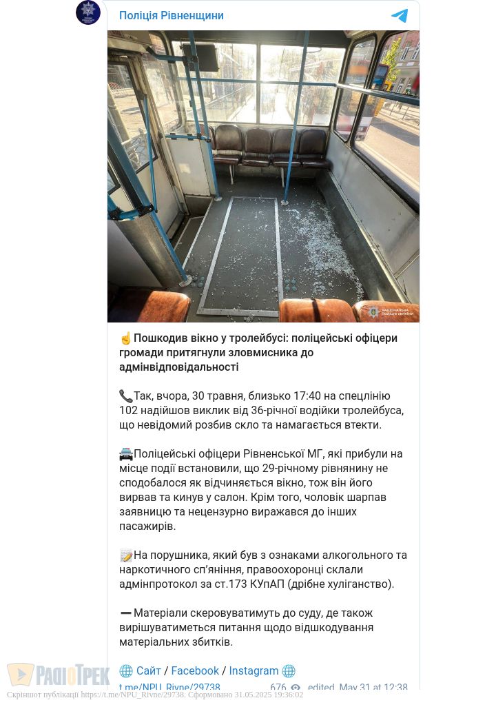 У Рівному чоловік пошкодив вікно у тролейбусі та намагався втекти. Такий виклик до поліції надійшов вчора, 30 травня.