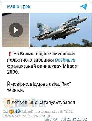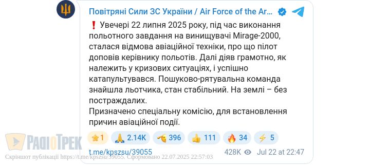 Під час виконання польотного завдання на винищувачі Mirage-2000 сталася відмова авіаційної техніки, повідомили у Повітряних силах ЗС України.