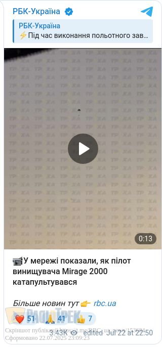 За словами очевидців, літак розхитувало зі сторони в сторону, з сопла двигуна виривалось полумʼя. Винищувач нахилився і почав падати, пілот катапультувався.