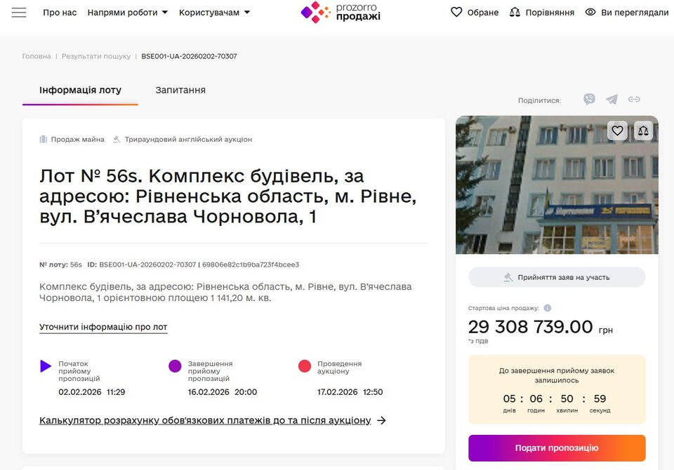 За майже 30 мільйонів гривень продають комплекс будівель у Рівному. Такий тендер оголосили днями на сайті Прозорро.