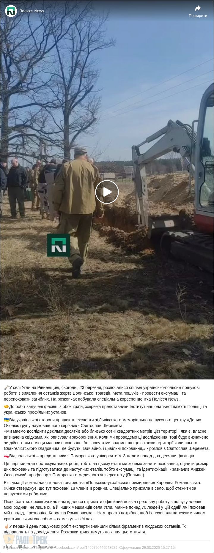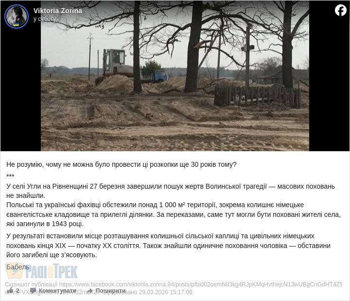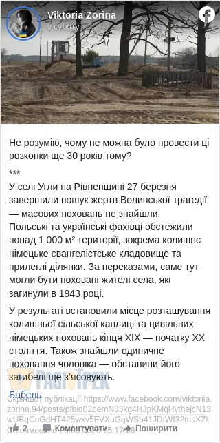 Спільна українсько-польська експедиція, яка з 23 по 27 березня 2026 року проводила пошукові роботи у селі Угли Сарненського району на Рівненщині, не виявила масових поховань поляків.