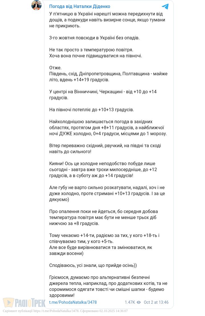 За прогнозом синоптикині Наталії Діденко, у п’ятницю, 3 жовтня, Україна нарешті отримає перепочинок від дощів. Повсюди опадів не очікується, а на півдні та сході навіть може визирнути сонце, якщо тумани не загородять його.