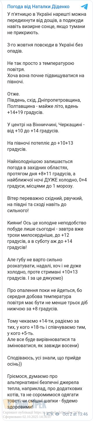 Тому насолоджуємося сонячними промінчиками там, де +14…+18°С, та тепло одягаємося там, де +5…+8°С, зауважує Наталка Діденко. Осінь завжди вирівнює температуру, тож готуємося до змін, гріємося, носимо шапки та не забуваємо про альтернативні джерела тепла — наприклад, пухнастих котиків!