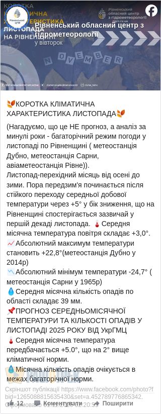 Листопад – це перехідний місяць від осені до зими. Пора передзим’я починається після стійкого переходу середньої добової температури через +5 градусів у бік зниження, що на Рівненщині спостерігається зазвичай у першій декаді листопада.