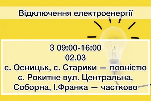 Повністю залишаться без електрики села Осницьк та Старики. У селищі Рокитне світло буде вимикатися частково на вулицях Центральна, Соборна та Івана Франка.