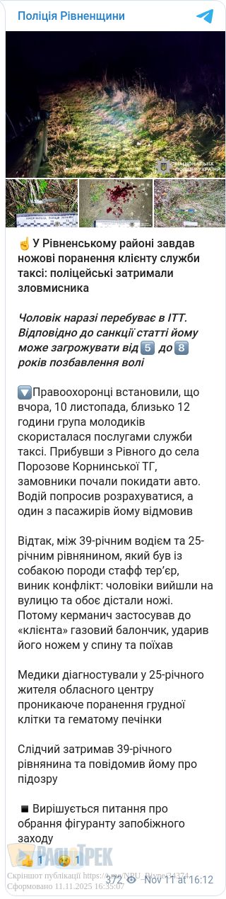 Відтак, між 39-річним водієм та 25-річним рівнянином, який був із собакою породи стафф тер’єр, виник конфлікт: чоловіки вийшли на вулицю та обоє дістали ножі. Потому керманич застосував до «клієнта» газовий балончик, ударив його ножем у спину та поїхав.