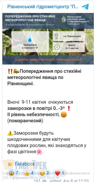 Уночі з 9 по 11 квітня у Рівному та області очікуються заморозки. В повітрі буде від нуля до -3 градусів.